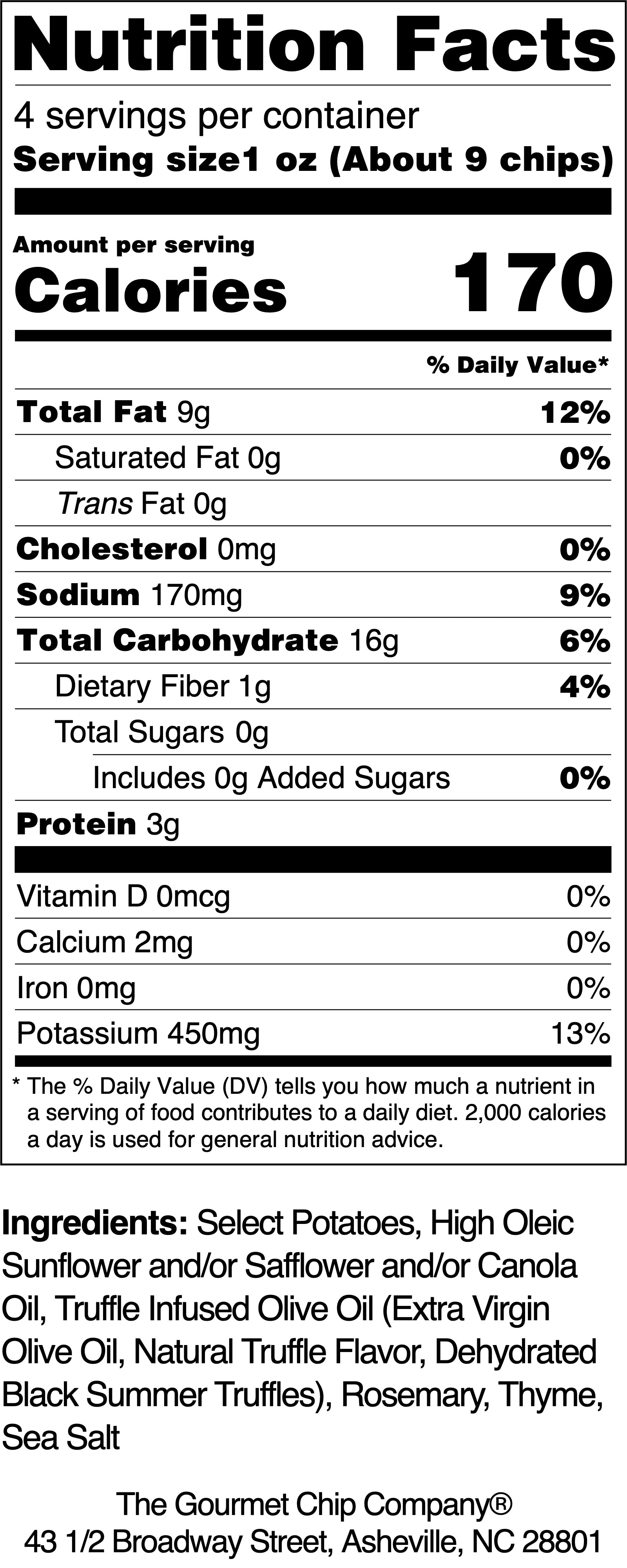 Select Potatoes, High Oleic Sunflower and/or Canola and/or Safflower Oil, Black Truffle Infused Olive Oil (Extra Virgin Olive Oil, Natural Truffle Flavor, Dehydrated Black Summer Truffles), Rosemary, Thyme, Sea Salt