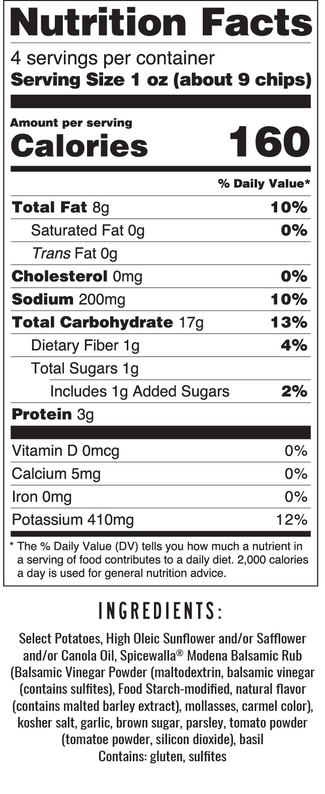 Our signature thick-cut potato chips dusted with Spicewalla® brand Modena Balsamic Blend, sun-dried tomato, Italian herbs and a hint of roasted garlic. (Contains Gluten, Sulfites)