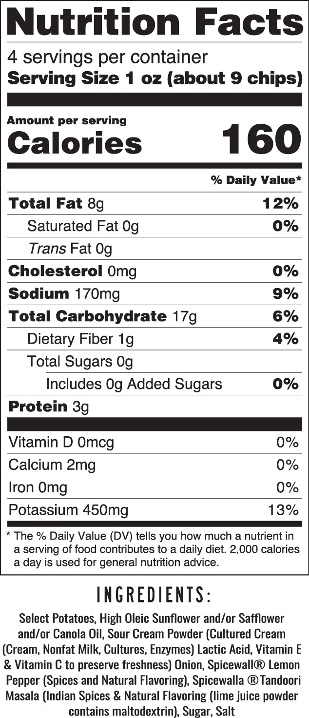 Select Potatoes, High Oleic Sunflower and/or Canola and/or Safflower Oil, Sour Cream Powder (Cultured Cream (Cream, Nonfat Milk, Cultures, Enzymes) Lactic Acid, Vitamin E & Vitamin C to preserve freshness) Onion, Spicewalla®, Lemon Pepper (Spices and Natural Flavoring), Spicewalla® Tandoori Masala (Indian Spices & Natural Flavoring (lime juice powder contains maltodextrin), Sugar, Salt